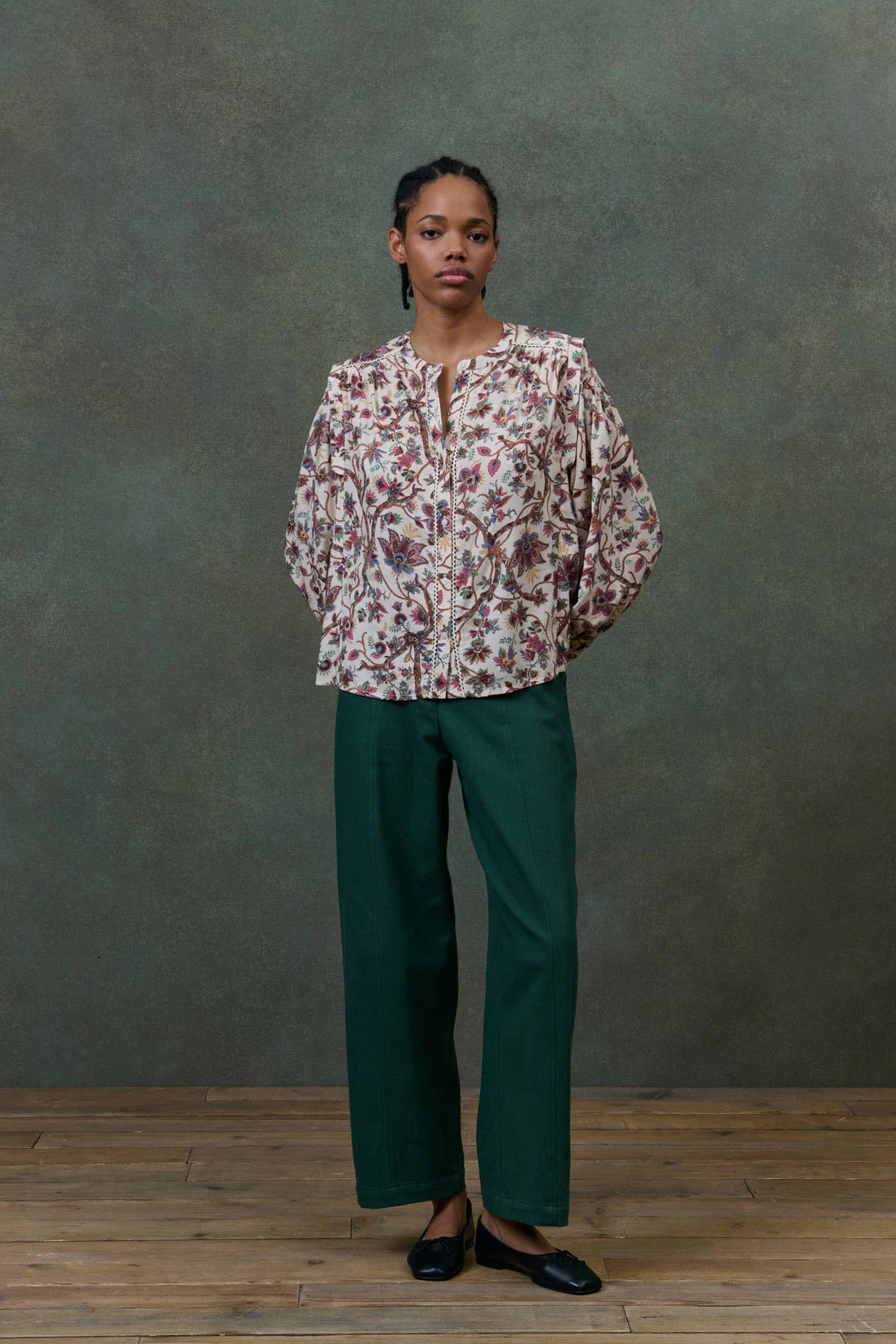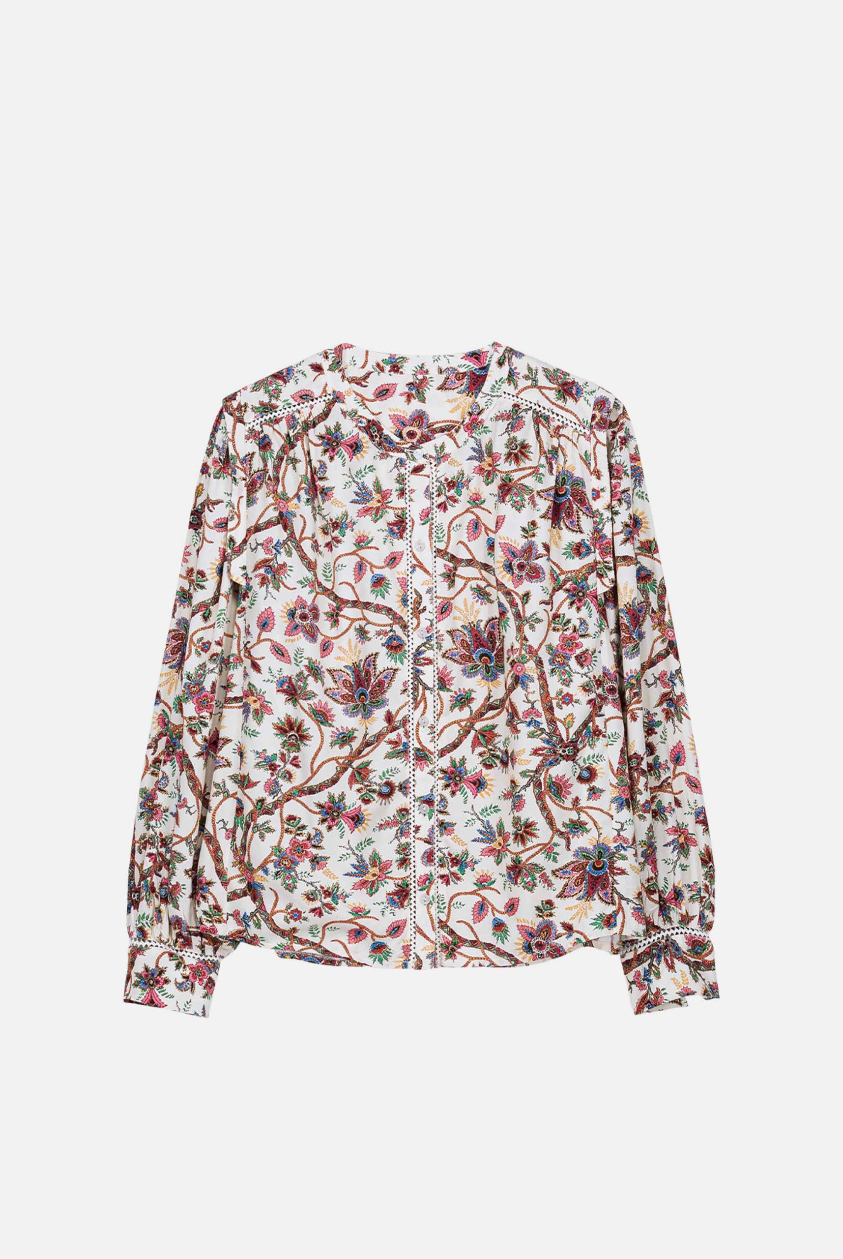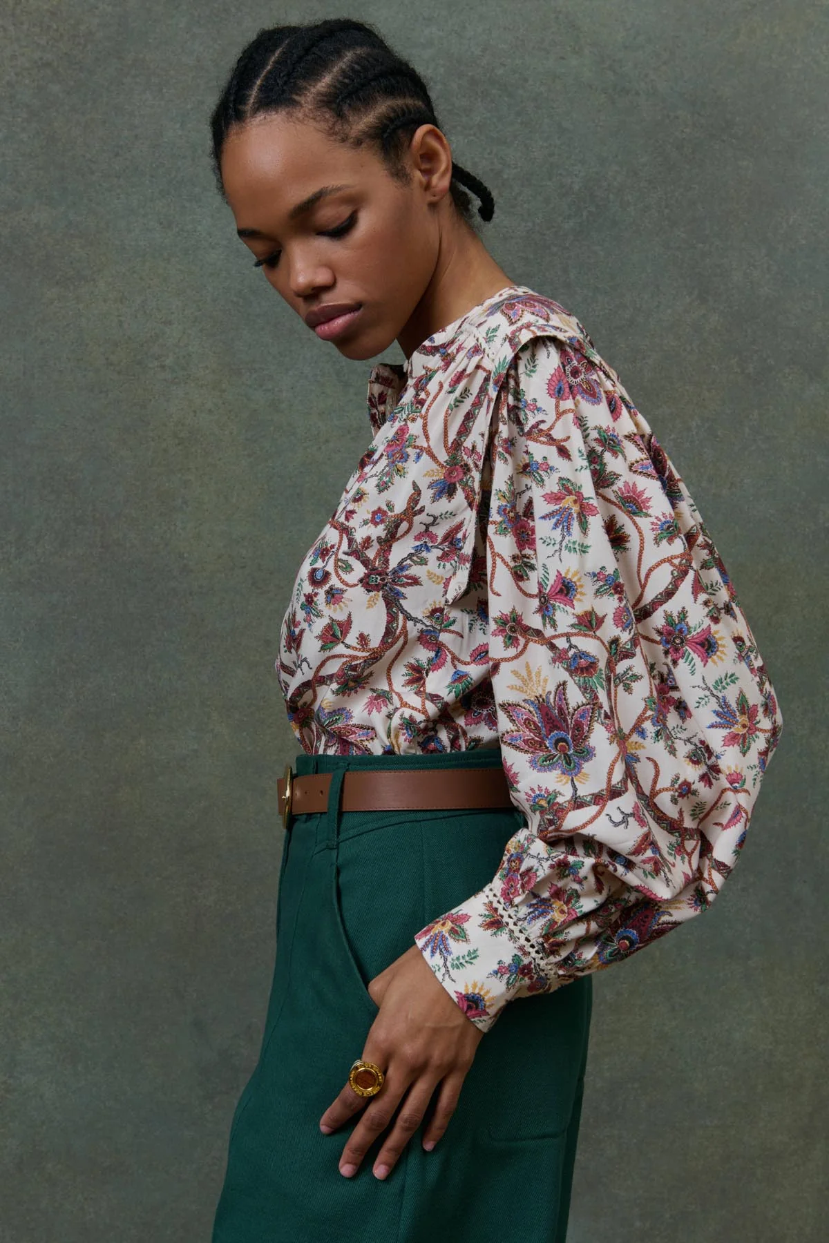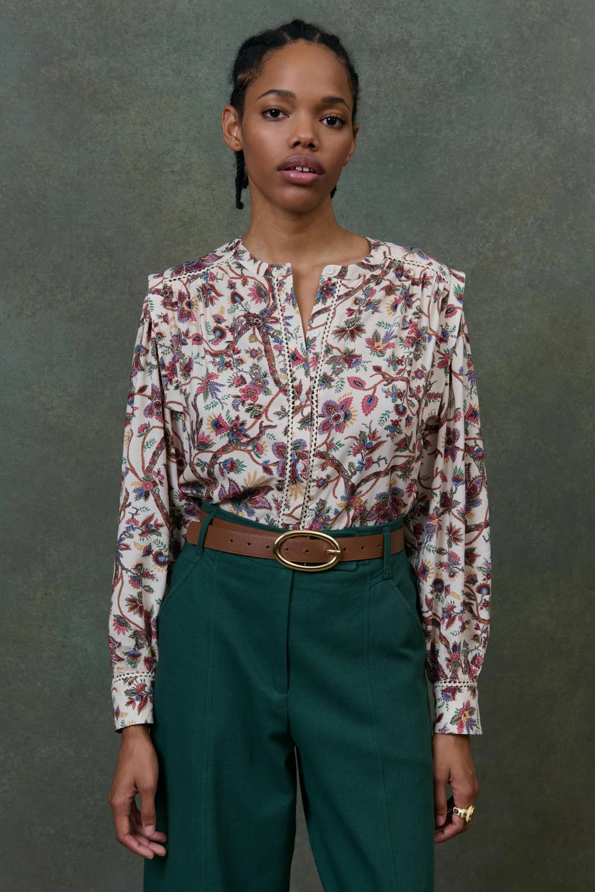 Chemise en crêpe fleurie avec boutons devant, manches bouffantes et poignets. Des fronces et de la dentelle décorent les épaules, le dos et les poignets pour un style raffiné.