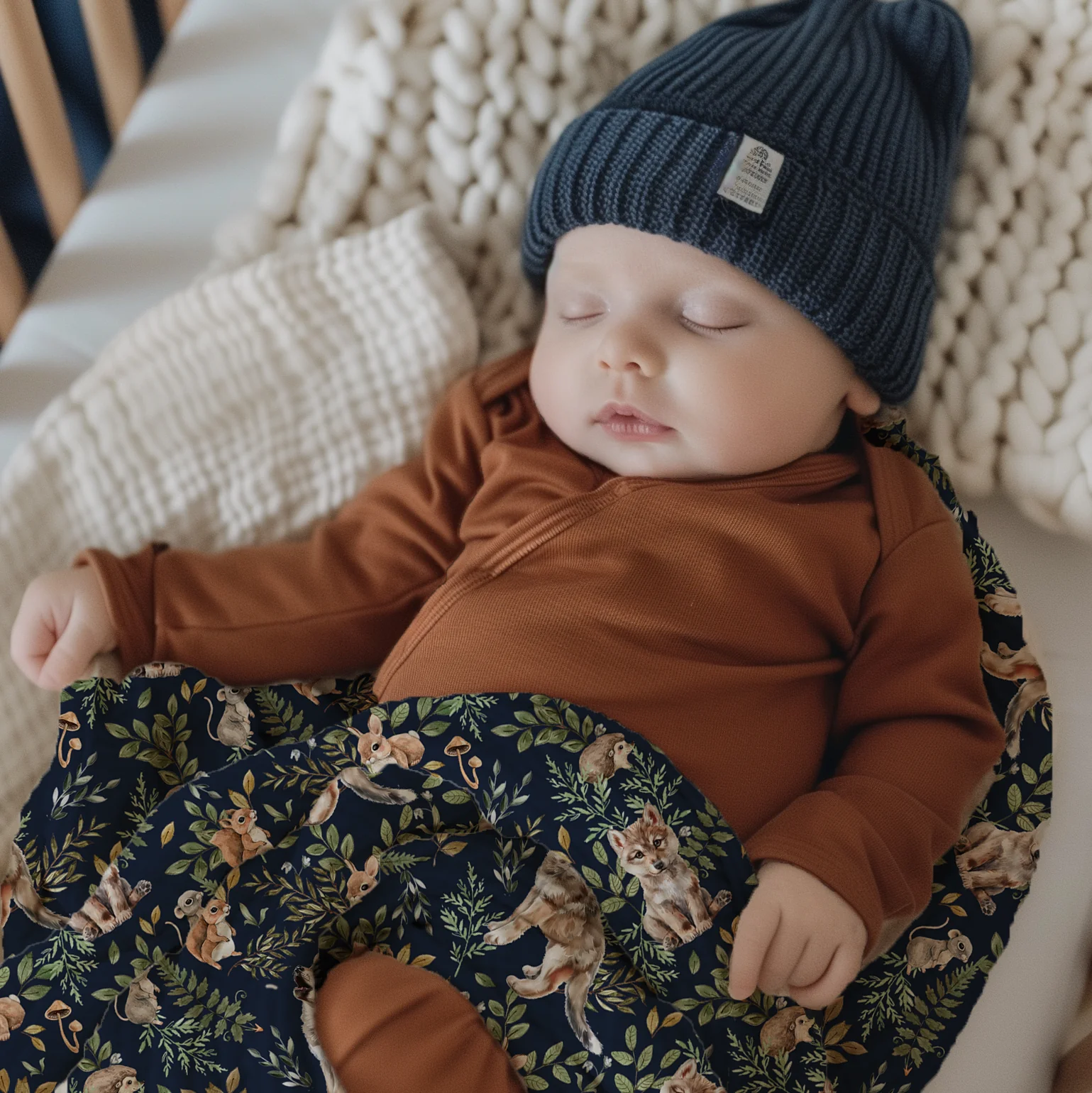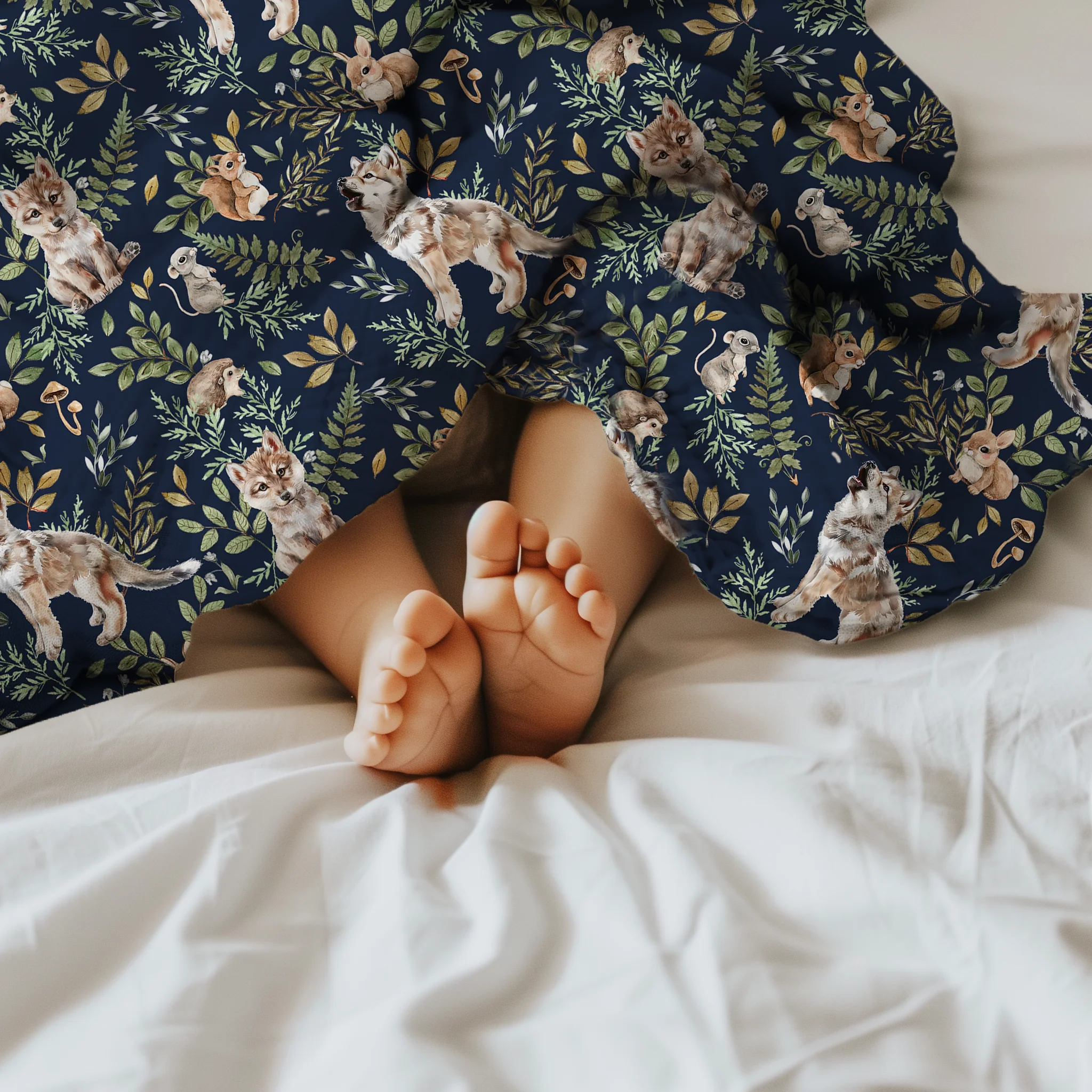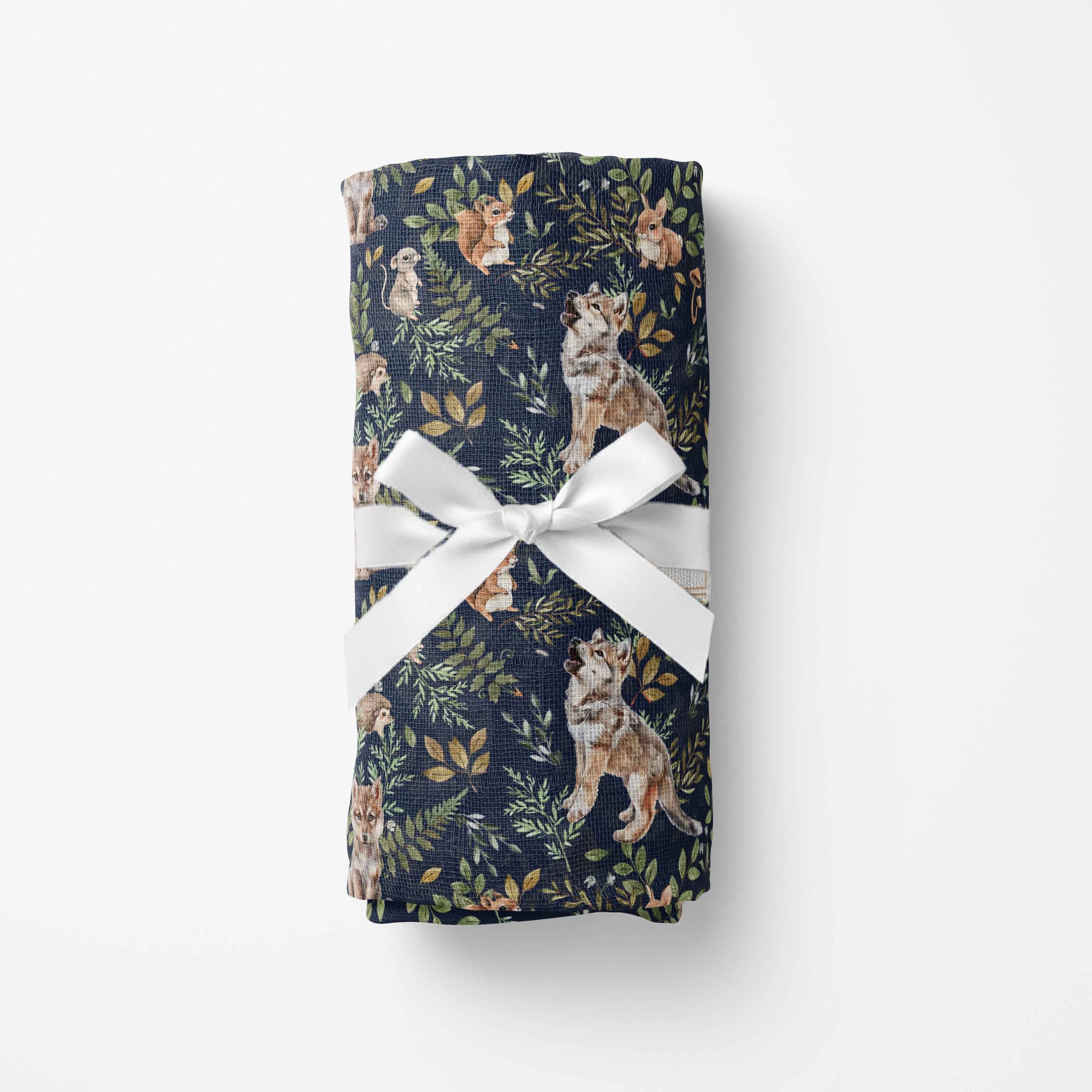 Conçue en mousseline de bambou de haute qualité, cette couverture allie douceur exceptionnelle et régulation naturelle de la température pour le confort optimal de votre bébé. Le motif délicat de loups de la forêt enchantée sur fond marine apporte une touche élégante et apaisante.