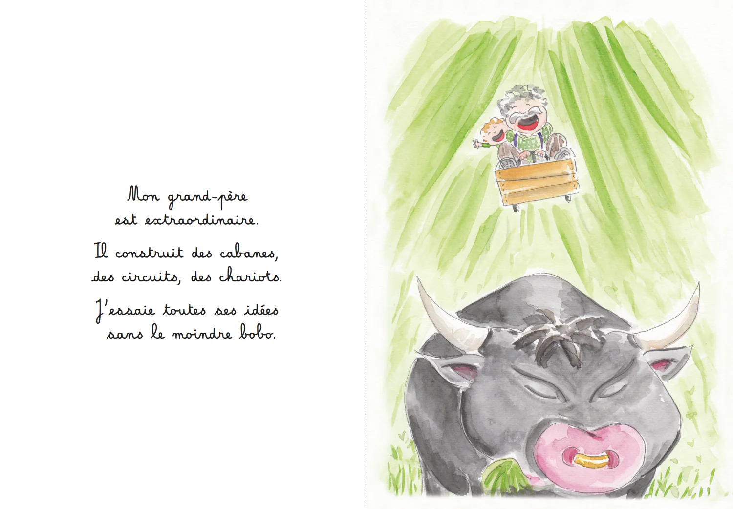 Mon grand-père est extraordinaire . Calé sur son tracteur, il évite les rosiers. Assis dans la remorque, j’attends de m’envoler . Un grand-père c’est extraordinaire ! Un livre-poème doux et espiègle qui raconte la place d’un grand-père dans le cœur de ses petits-enfants.