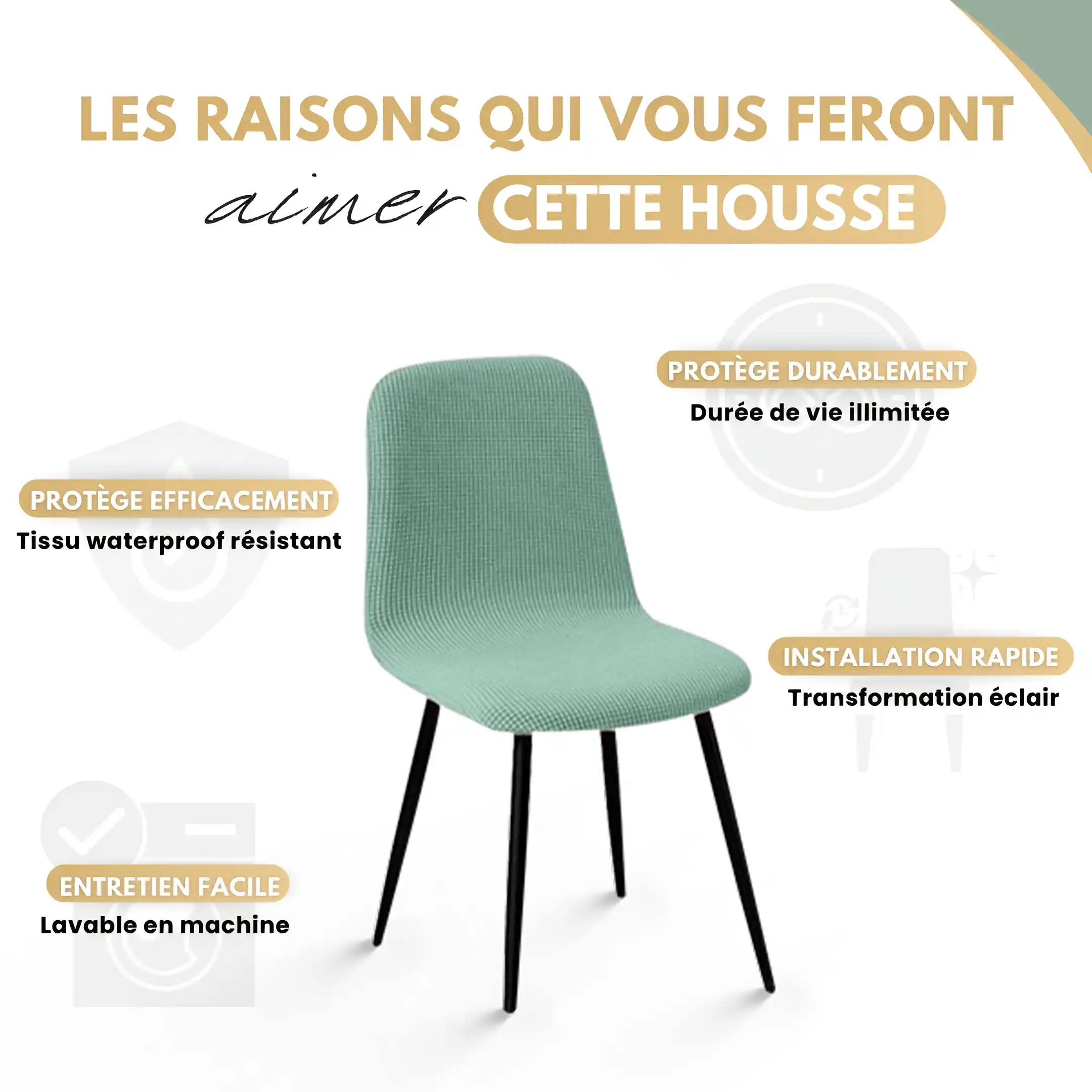 Notre housse de chaise Jade saura parfaitement s’assortir aux chaises de votre maison. Aussi bien pour vos chaises de cuisine, que de salon, vous pourrez les protéger et y apporter un look élégant et frais.