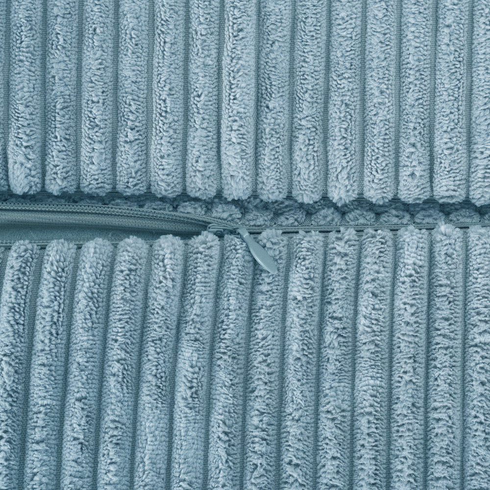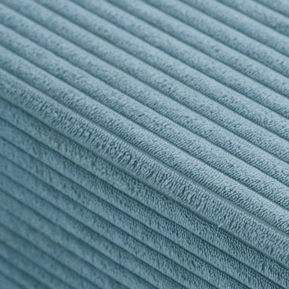 La housse en velours côtelé bleu est amovible et lavable en machine. Le polyester résiste bien aux taches et à un usage intensif.