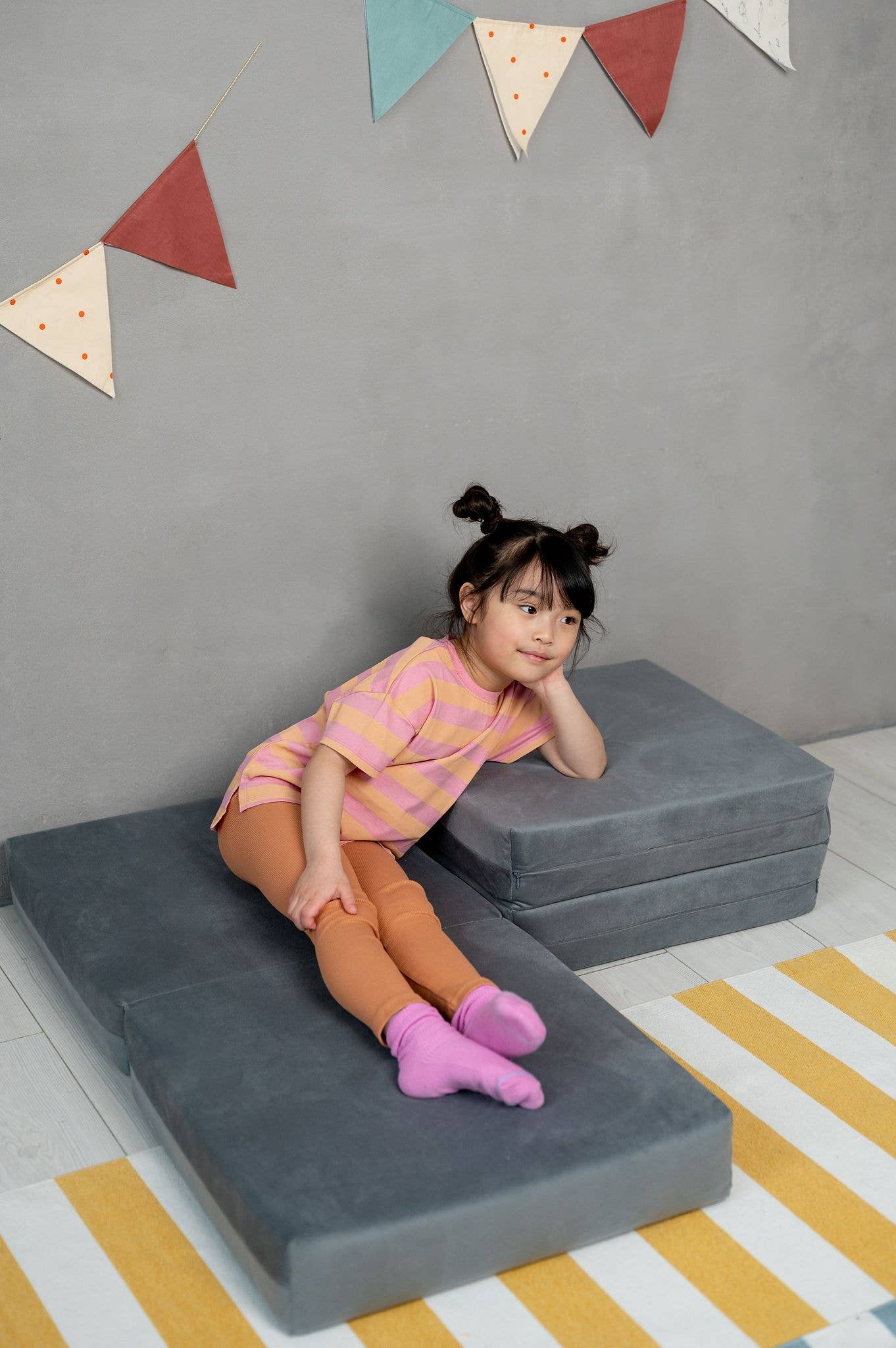 Une série de matelas en mousse pour jouer, s’asseoir et s’allonger. Chaque meuble peut être plié de manière à occuper le moins de place possible après utilisation. Le produit est fabriqué en mousse « rembourrée » durable garnie d’un délicat matériau Velvet Soft.