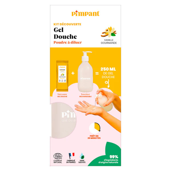 Pimpant — Kit découverte Gel douche vanille gourmande poudre à diluer – 1 bouteille + 1 recharge