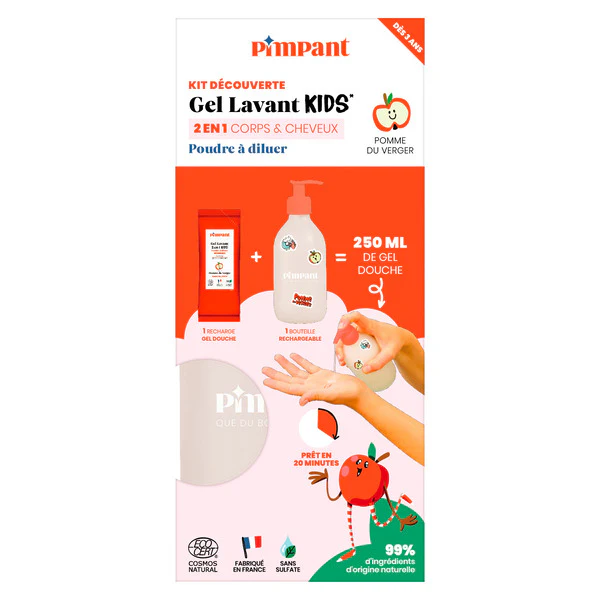 Pimpant — Kit découverte Gel lavant Kids 2 en 1 pomme du verger poudre à diluer – 1 bouteille + 1 recharge