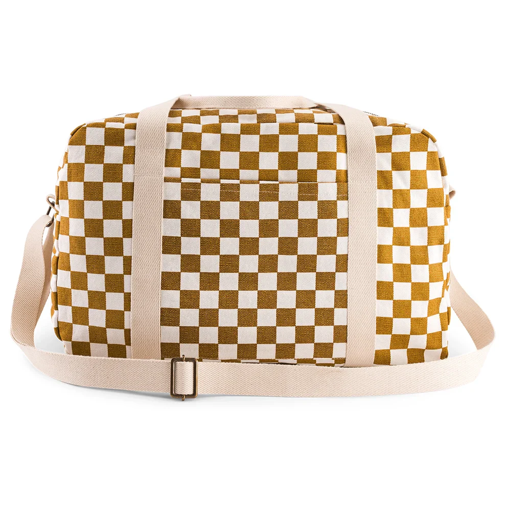 Notre sac Raphael imprimé Damier est le sac idéal pour transporter les affaires de bébé le temps d’une sortie en famille ou d’un week-end. Vous pourrez également l’adopter pour vous en sac week-end ! Son format et ses poches intérieures et extérieures vous permettront d’avoir à porter de main tous les essentiels de bébé : couches, biberon, matelas à langer, tétines,… Grâce à sa bandoulière réglable, vous pourrez le porter à l’épaule ou l’accrocher à la poussette. Fabriqué au Portugal, notre sac à langer Raphael est confectionné dans un canevas de coton, matière durable et résistante.