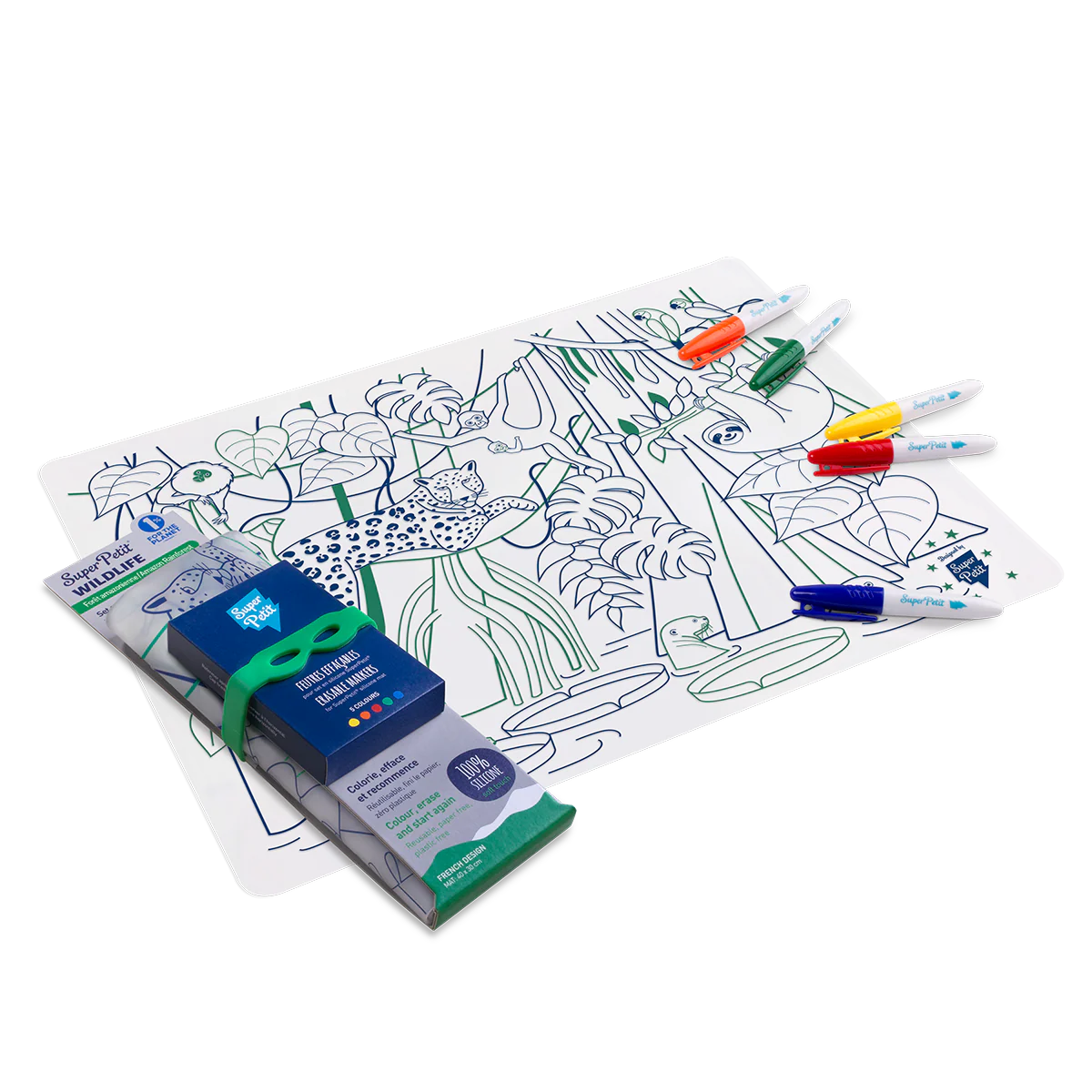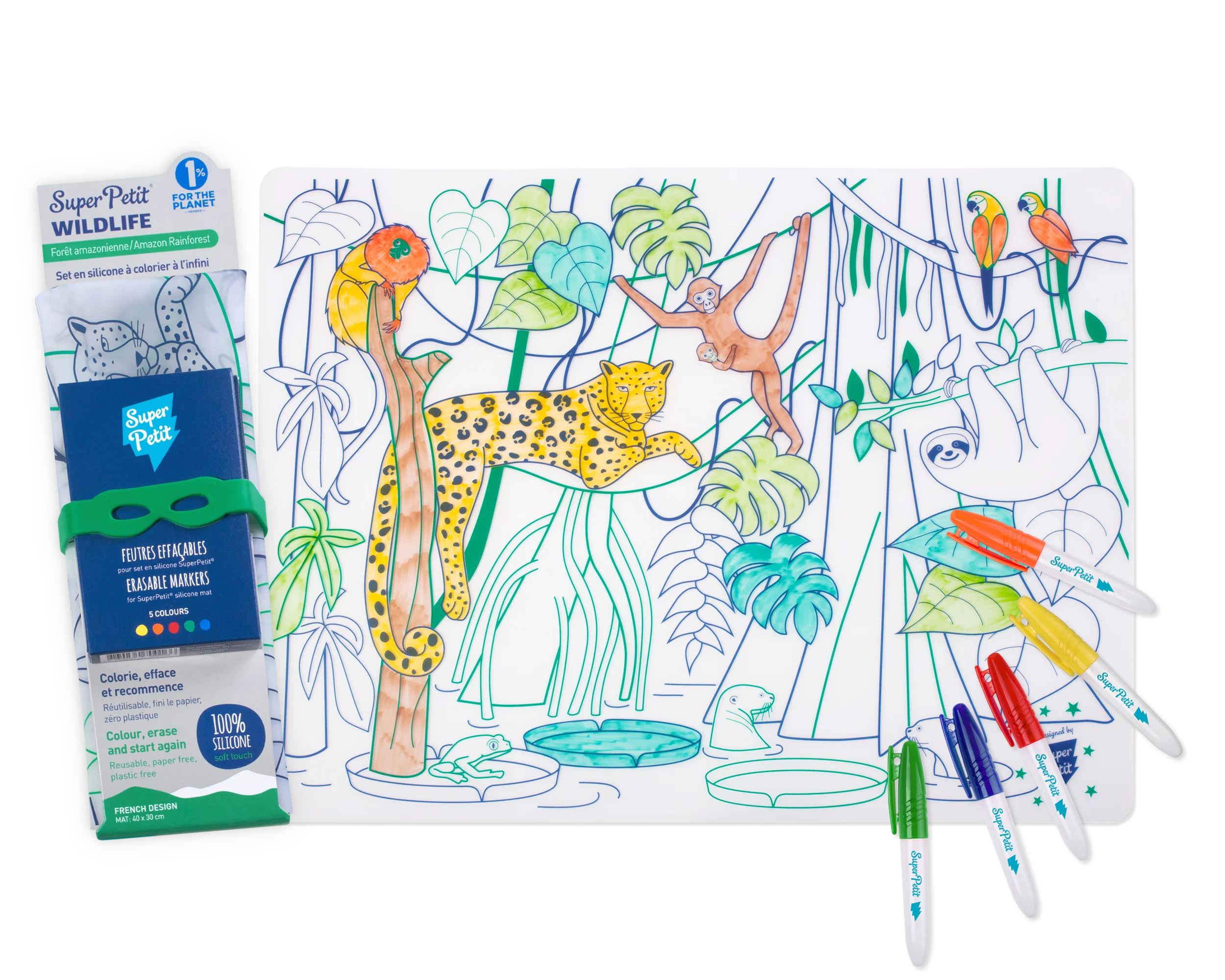 - Contenu : 1 set en silicone représentant la végétation luxuriante et les animaux colorés de l’Amazonie, 5 feutres aux couleurs vives et 1 bracelet exclusif.